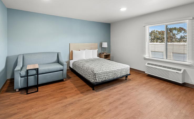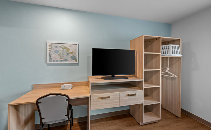 Staying at our hotel helps you save on everything you need for a long visit. Our hotel offers low weekly and monthly rates, which all include convenient amenities like free WiFi, free coffee, and free parking. Our suites can accommodate single travelers or up to four guests, as well as furry companions when you book one of our pet-friendly guest rooms. All suites come furnished with an in-room kitchen, a flat-screen TV, and work table with chairs. Additional amenities include a fitness center, vending machines, and laundry facilities.