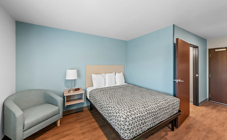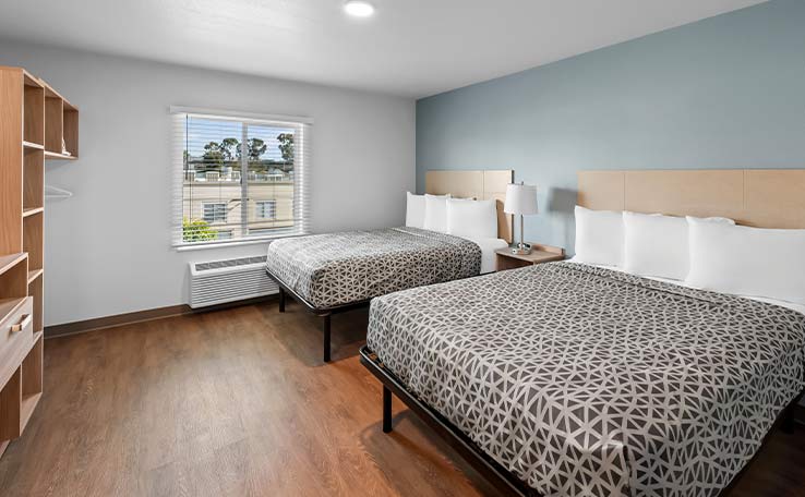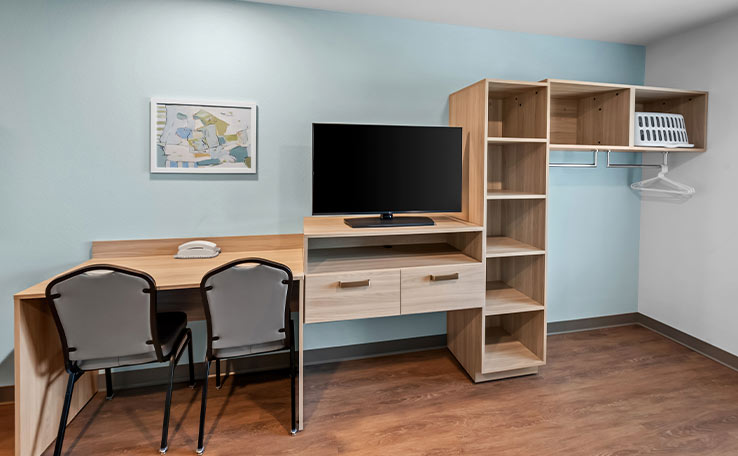 Our guest suites include one or two queen beds, giving you the flexibility of traveling solo or as a group of up to four guests. Our accommodations include a flat-screen TV and table and chairs, so you can stretch out and relax or stay focused on work. Each suite includes an in-room kitchenette with a microwave, refrigerator, 2-burner cooktop, and sink. Housekeeping is provided every other week for guests staying longer, or you have the option of scheduling additional cleaning for a fee. Plenty of storage space lets you keep your belongings in order. Should you find you need additional items like a coffee maker, pots and pans, our front desk is where you can purchase these items when available.