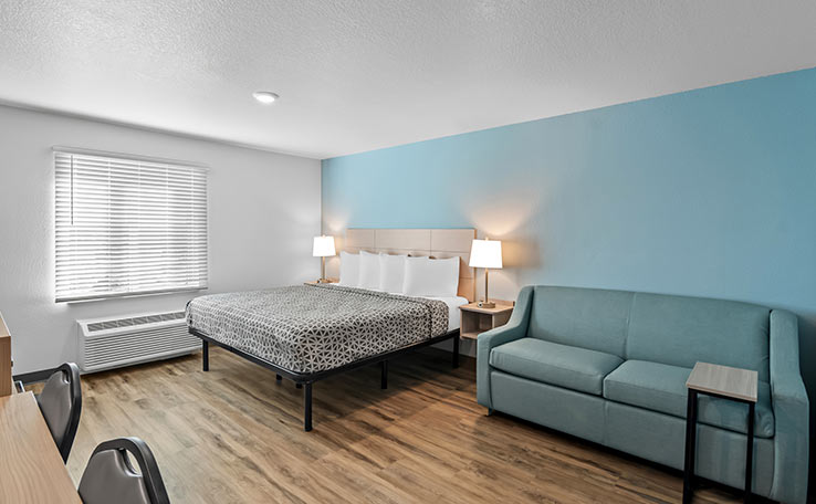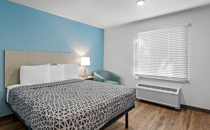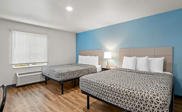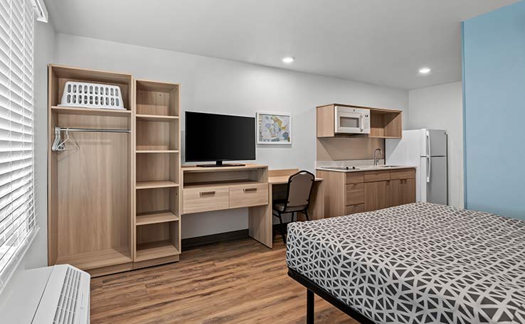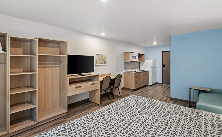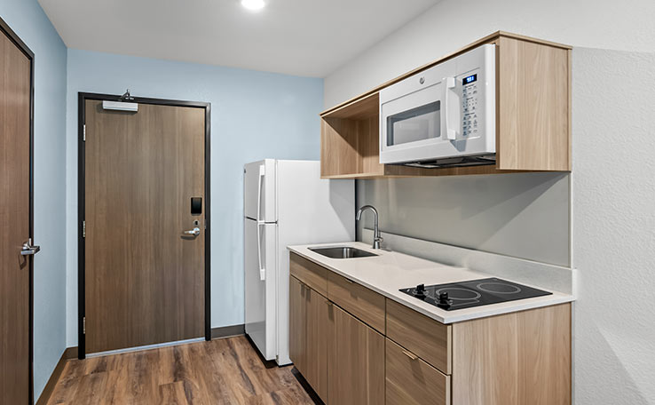 Every suite at our extended stay hotel features an in-room kitchen with a full-size refrigerator/freezer, two-burner cooktop, microwave, and sink. Watch your favorite programs on a flat-screen TV or have a seat at your dedicated work table and stay productive. Housekeeping is provided every other week with the option of additional cleaning for a low fee. King- and queen-bed room options allow for a single traveler or up to four guests with plenty of space to stretch out and relax. Storage space lets you keep important items close at hand during your visit.